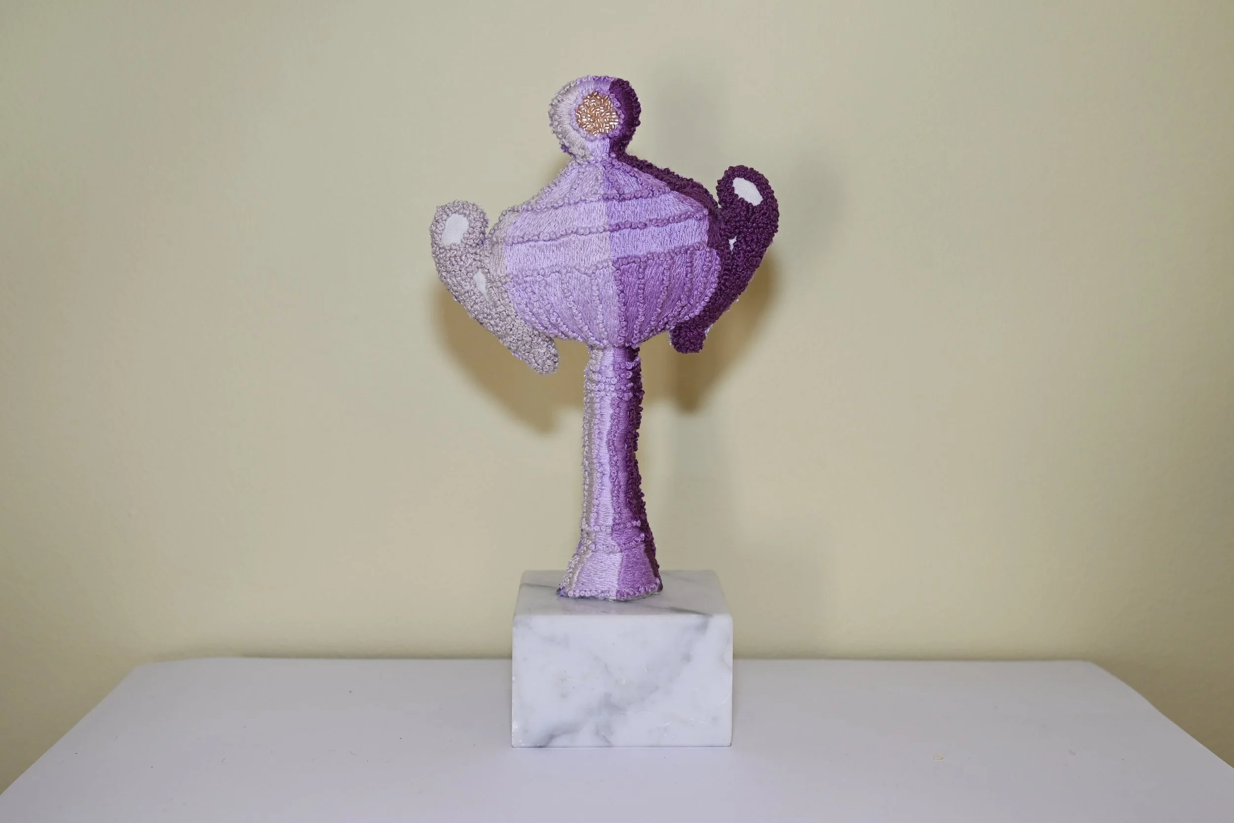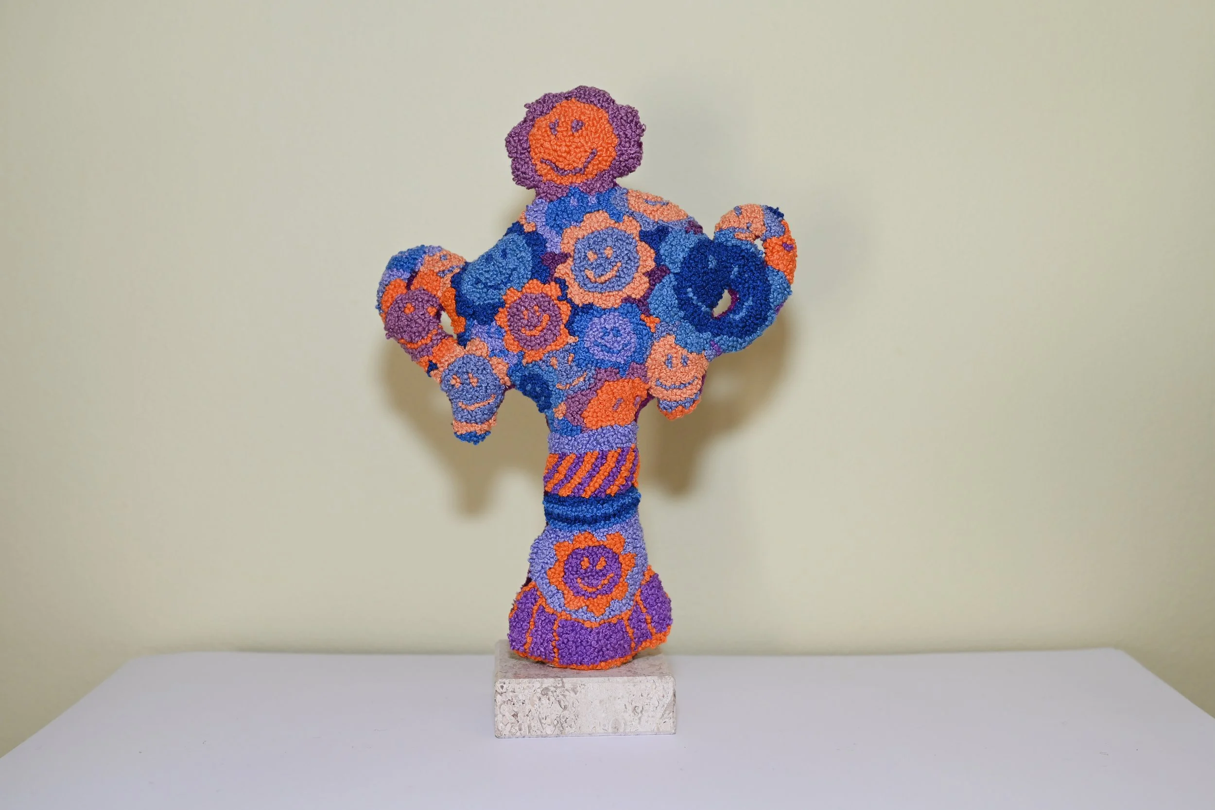 She also presents six textile trophies, created with embroidery and glass pearls, shaped as colorful sculptures — some adorned with flowers, ribbons, and smileys. With titles such as Almost Flawless and Rising Star, they reflect on both victory and defeat, challenging hierarchies between art, sport, and femininity.