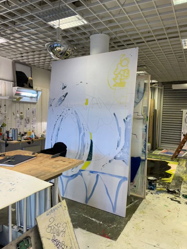 Tredje Badbollen (The Third Bath Ball) (250 × 177 cm) introduces a playful energy through shades of blue and yellow that balance warmth and stillness. The thin layers of watercolour and oil allow the polyester surface to shine through, revealing its texture and transparency. The result is a light, spontaneous composition that invites both reflection and movement.