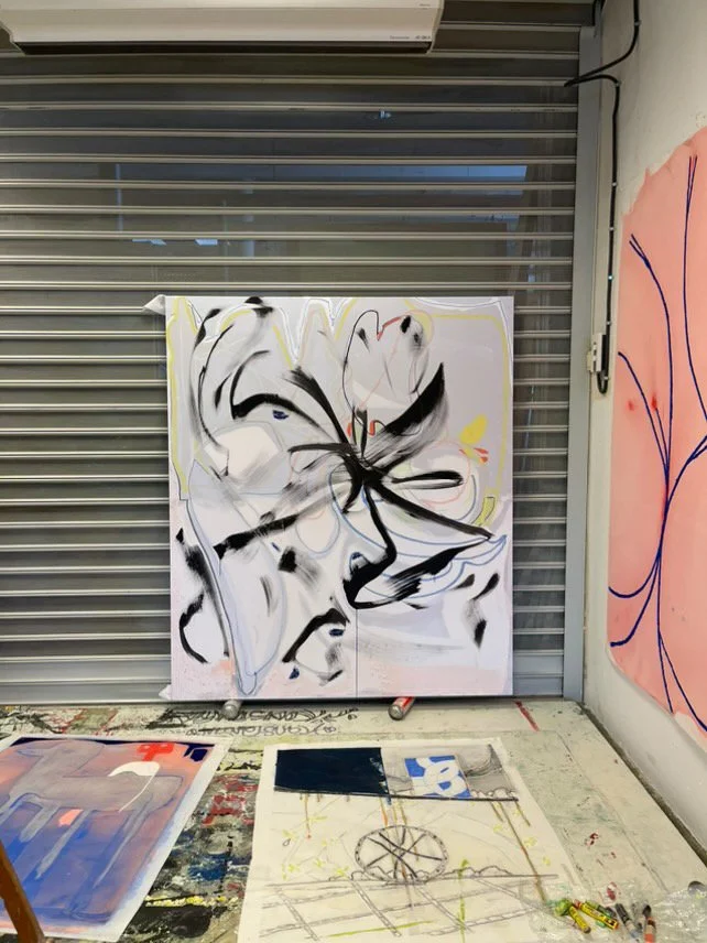 Painting plus a sculpture I made in a room with a mural (266 × 333 cm) combines structural lines and shifting perspectives with expressive colour fields. The work appears as a hybrid between painting and drawing, where the monumental format allows the composition to unfold as a spatial object.